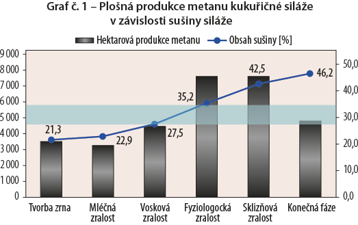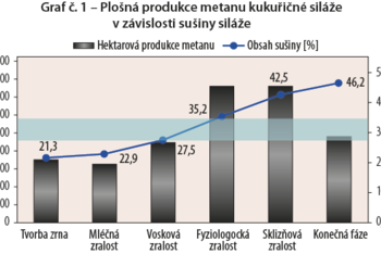 Na grafe č.1 je zobrazená produkcia metánu v závislosti na fyziologickej zrelosti porastu kukurice pri zbere. Najvyšších produkciou je dosahované u porastov s rozmedzím sušiny 35-42%. Zo skúseností pestovateľov možno odporučiť vyššiu sušiny. U BPS nedochádza k zníženiu stráviteľnosti škrobu ako u dobytka a zníženie stráviteľnosti vlákniny je v uvedenom rozmedzí minimálnej a možno ju eliminovať prevádzkovými opatreniami na BPS.