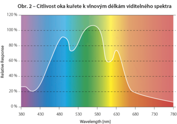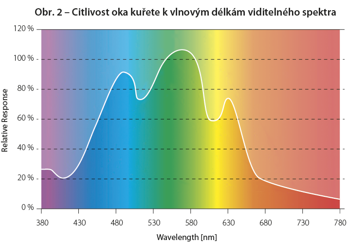 Ľudia aj hydina vykazujú maximálnu citlivosť k časti spektra s vlnovou dĺžkou 545-575 nm, ale hydina je citlivejšia na modrej a červenej časti vlnového spektra (pozri obrázok 1 a 2). Ľudské vnímanie svetla sa ďalej líši citlivosťou na každú farbu, ktorá závisí na hustote konkrétnych typov fotoreceptorov. Kurčatá vnímajú červené svetlo trikrát jasnejšie než ľudia. Táto vynikajúca schopnosť vidieť jednotlivé farby a širšie spektrum vlnových dĺžok naznačujú, že vtáky vidí zložité svetlo (ako biele svetlo) odlišne ako ľudia.