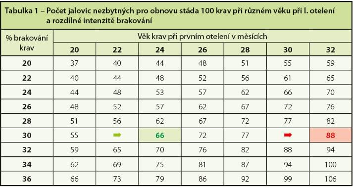 V tabuľke 1 je uvedené porovnanie počtu jalovíc nutný k prirodzenej obnove stáda s veľkosťou 100 kráv, a to pri ich rôznom veku pri prvom otelení a rozdielne intenzite brakovanie. Napríklad, pri 30% brakovanie v stáde a veku jalovíc pri prvom otelení 24 mesiacov, chovateľ potrebuje pre obnovu stáda minimálne 66 jalovíc. Pri rovnakej intenzite brakovanie, ale telenie jalovíc až vo veku 32. mesiacov, potrebuje chovateľ k obnove stáda už 88 jalovíc. Rozdiel medzi oboma príkladmi je 22 jalovíc, ktoré by mohli byť predané (22 jalovíc × 28 000 Sk = 616 000 Sk).
