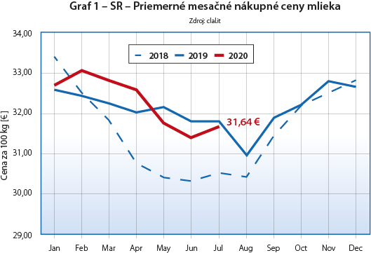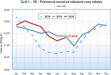 V roku 2019 priemerné mesačné nákupné ceny mlieka v SR klesali od januára až do augusta z 32,58 €/100 kg na 30,95 €/100 kg, kde sa odrazili od dna a do konca roka stúpali a v decembri skončili na 32,64 €/100 kg (graf 1).