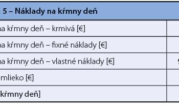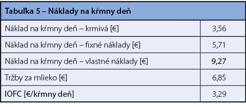 V posledných rokoch sa na hodnotenie príjmu finančných prostriedkov nad cenu krmiva používa ukazovateľ IOFC (tržby za mlieko znížené o náklady na krmivá), uvedený v tabuľke 5. Sledovaním tohto ukazovateľa vytvárame predpoklad na ekonomickú mliečnu produkciu, pričom je IOFC ovplyvnený cenou mlieka a cenou krmív. Cieľom je mať dostatok finančných prostriedkov na úhradu ostatných nákladov v chove dojníc. Prakticky sa od mesačných tržieb za mlieko odrátajú náklady na krmivá a rozdiel sa podelí kŕmnymi dňami všetkých dojníc za daný mesiac. Pre pokrytie všetkých ďalších nákladov (hranica rentability) je potrebných cca. 3,5–4 € na kŕmny deň.
