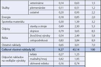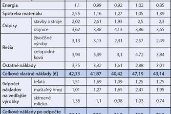 Priemerná veľkosť sledovaných chovov v roku 2019 (tabuľka 1) predstavovala 261 dojníc s priemernou dodávkou mlieka 21,49 kg na kravu s realizačnou cenou 0,3189 €/kg mlieka. Celkové vlastné náklady na kravu dosiahli úroveň 9,27 €/kŕmny deň, resp. 0,4314 € na kg predaného mlieka. Celkové vlastné náklady po odpočte vedľajších výrobkov sa znížili na 8,42 €/kravu a na 0,3920 €/kg mlieka. Poľnohospodárske podniky dosiahli stratu 0,0731 € na kg mlieka. Zarátaním priamych dotácii vo výške 0,0522 €/kg mlieka sa výrazná strata mierne znížila, ale stále bola v zápornom salde -0,0208 €/kg mlieka.