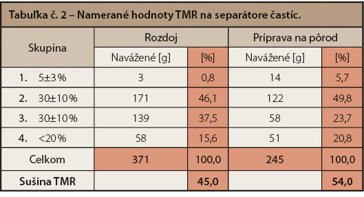 Na obrázku č. 2 sa nachádza preosiata TMR pre kravy v príprave na pôrod. V tejto skupine je cieľom pri vysokej dávke slamy (až do 5 kg) dosiahnuť na hornom site 5–10 % dlhých častíc (tabuľka č. 2). Takto namiešaná TMR nám zabezpečí, že kravy nebudú selektovať predložené krmivo a po otelení budú mať dostatočne naplnený bachor pre dobrý štart do laktácie so zníženým výskytom metabolických porúch. Pridávané väčšie množstvo slamy spôsobí vzostup sušiny TMR s oddeľovaním jednotlivých zložiek a v takom prípade je možné použiť vodu na zabránenie separovania z dôvodu vysokej sušiny takto namiešanej TMR.
