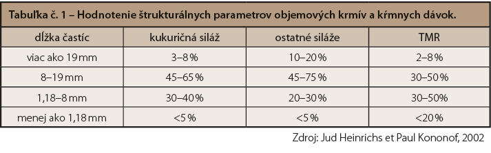 Nie vždy však rozdiely vo veľkosti častíc musia viesť k rozdielom v bachorovom pH. Pri hodnotení kŕmnej dávky s cieľom určiť možné riziko subklinickej acidózy je potrebné dať do súvisu množstvo vlákniny, neštrukturálnych sacharidov a rýchlosť ich fermentácie v bachore. Problémy vznikajú aj pri dlhom čase miešania TMR v kŕmnom voze, keď klesá podiel častíc na hornom site (>19 mm) separátora, resp. dochádza k posunu častíc z hora nadol pri znížení podielu na horných dvoch sitách na menej ako 50 %. Pri nadmernom premiešavaní TMR sa veľkosť častíc opäť zmenšuje, znižuje sa čas prežúvania a tvorby slín, čo môže viesť k zdravotným problémom (napr. acidóza bachora, poruchy pohybového aparátu, posunutie slezu, zníženie príjmu krmiva, zníženie mliečneho tuku, kondičného skóre). Kravy s poruchami pohybového aparátu majú nižší príjem krmiva za súčasného poklesu príjmu sušiny a produkcie mlieka.