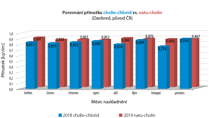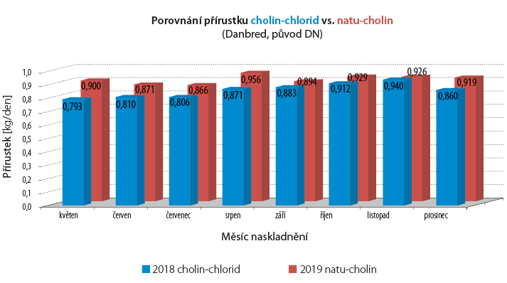 - Toto môžeme vysvetliť tým, že prírodné cholín zlepšuje lipidový a energetický metabolizmus, čo znamená vyššiu absorpciu živín a vyšší prírastok.