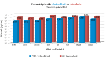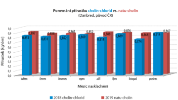 - Výsledky ukázali väčší váhový prírastok pre skupinu kŕmenou prírodným cholínom v porovnaní so skupinou kŕmenou cholín chloridom v roku 2018.